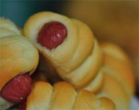 - Ambil satu bahagian dan buatkan panjang kemudian lilit pada sosej. Selitkan kedua-dua hujung ke dalam dengan kemas supaya tidak terbuka semasa proses pengembangan doh. Tinggalkan sedikit ruang dihujung sosej dengan tidak berbalut dengan doh supaya bila doh mengembang doh tidak terkeluar dari sosej.